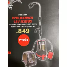 משאבת מים 450W + מטען+סוללה 4A EINELL היינל גובה סניקה : 7 מטר הספק: 3000ליטר לשעה הספק : 450W סוללה: 18V 3Ah
